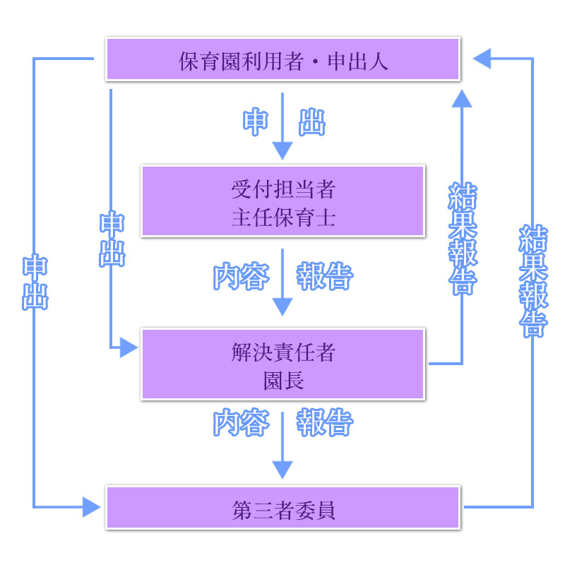 本園においてもこのような法改正の趣旨に沿って、保護者の皆様と保育園のコミュニケーションの活性化を目指して「意見・要望・苦情・不満」を解決する為の規定を設け、利用者の皆様の要望等に的確に応え、より良い保育園づくりを進めてまいりたいと考えております。お気づきのことがあれば、積極的に保育園に対してご要望等をお寄せくださるようお願い申し上げます。仕組みは以下の通りです。